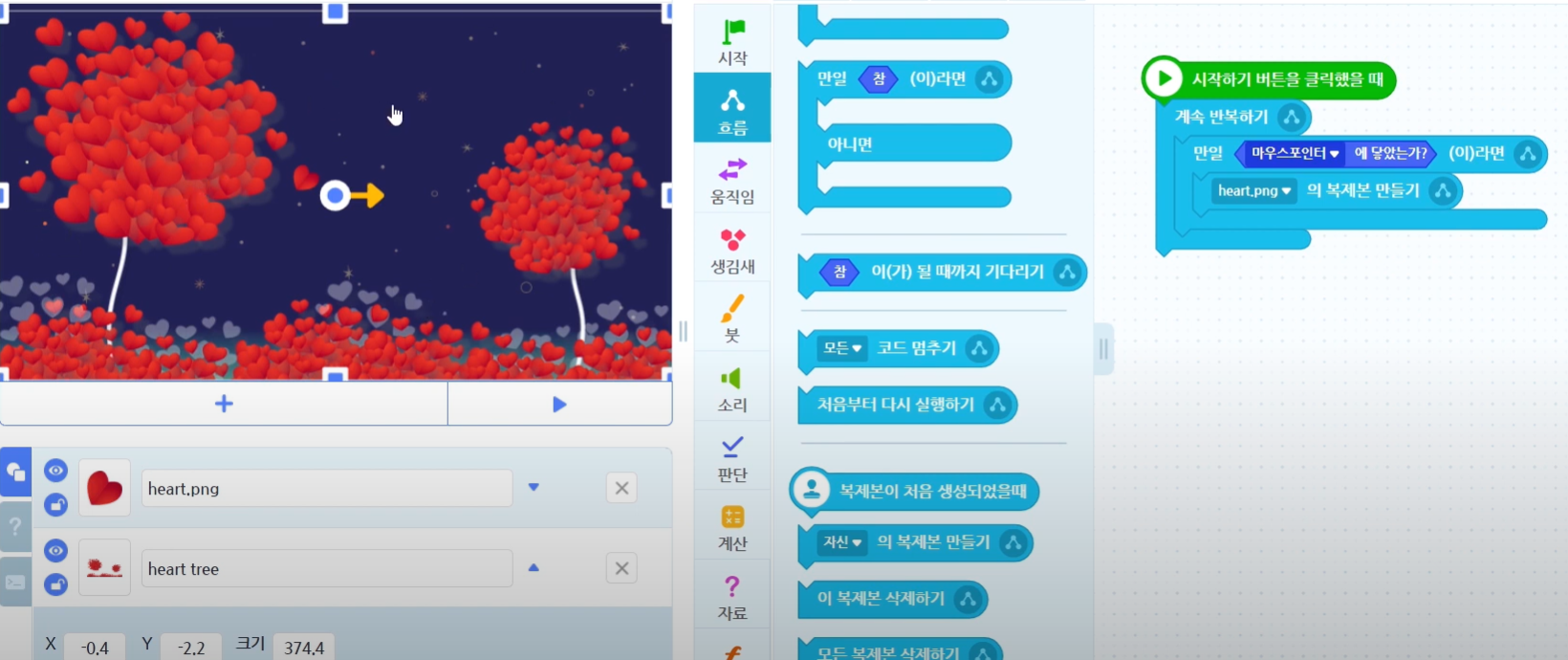하트트리는 마우스 포인터에 닿을 때마다, 하트 오브젝트가 복제되도록 해줄 거예요.