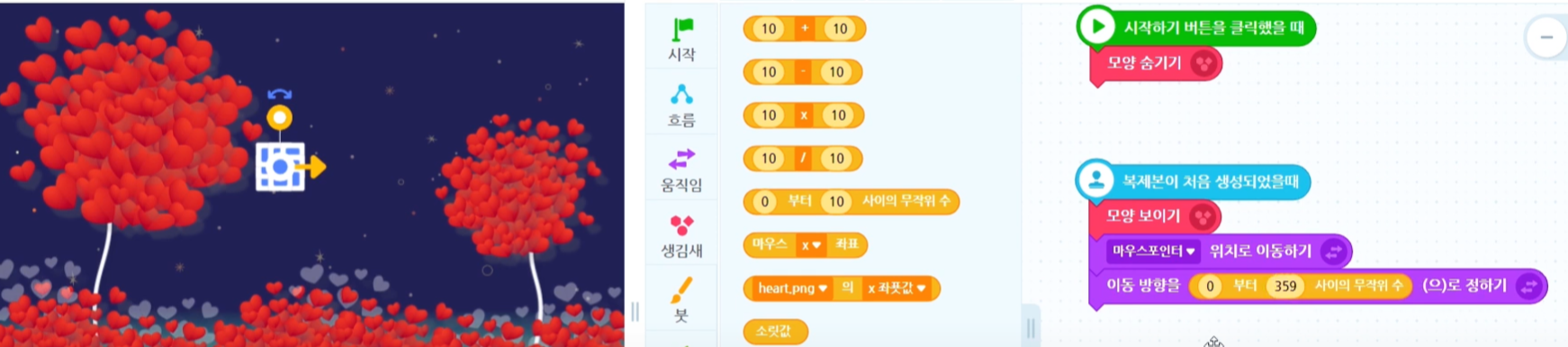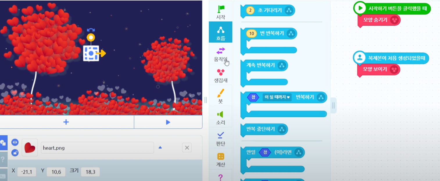 | [엔트리 기초 강의] 44. 하트를 만들어내는 하트 트리 디지털 엽서 만들기 2편 (0) | 2020.12.26 |