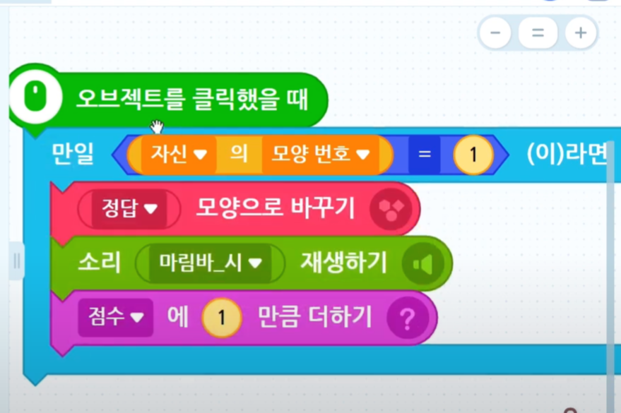 그러면, "오브젝트를 클릭했을 때"라는 블록에 코딩을 해 주면 되겠죠~