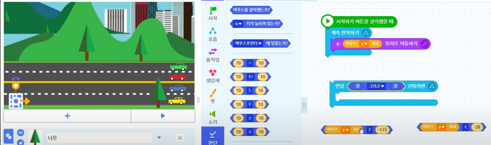 이렇게 범위를 정하기 위해서는 블록 코딩에서 [그리고]라는 블록 사이에 아래의 조건을 넣어주면 된답니다.
