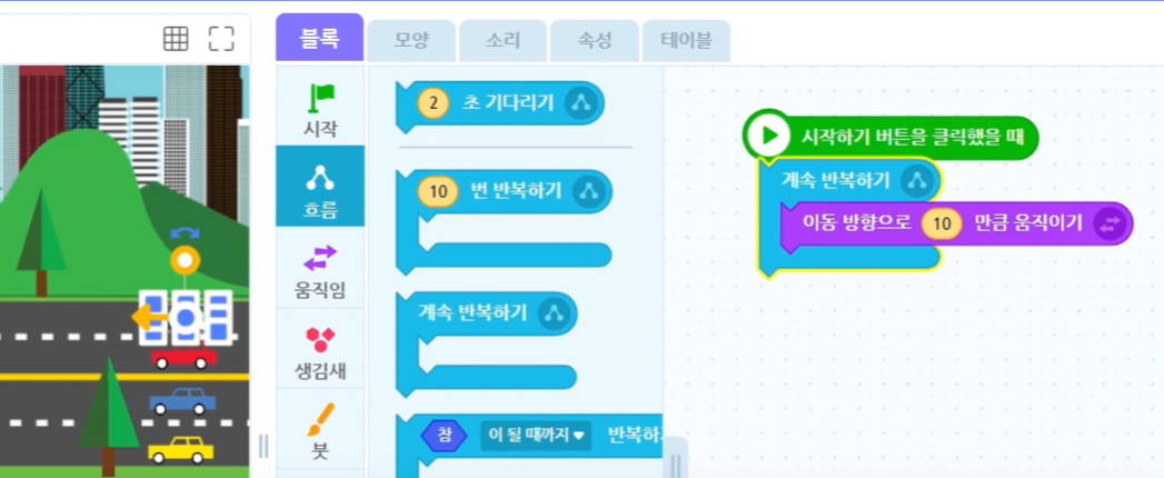 자동차는 왼쪽방향으로 이동방향을 사용해서 계속 움직이도록 만들어 줄 거랍니다.