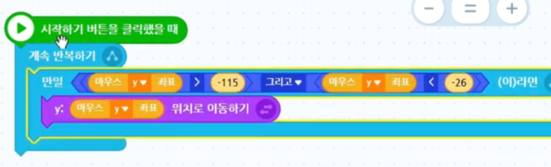 그래서 -115< 마우스 y좌표 < -26 인 범위 내에서만 움직이도록 만들어 줄 거예요.