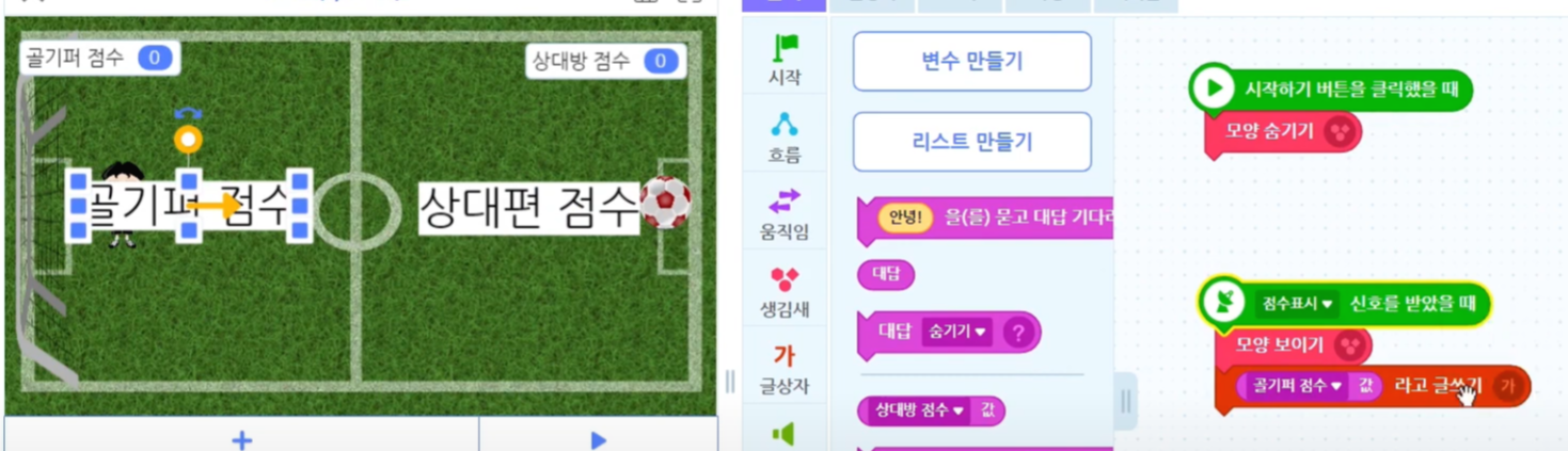 지난 시간에, 공이 날아가고, 골대에 닿았는지, 골키퍼가 막았는지 체크하는 코딩까지 만들었죠!