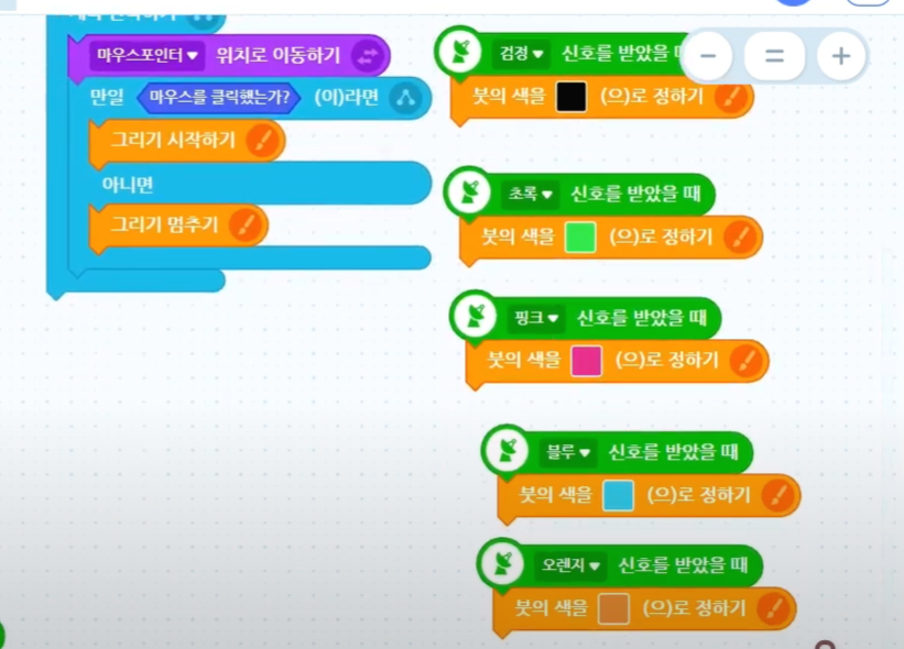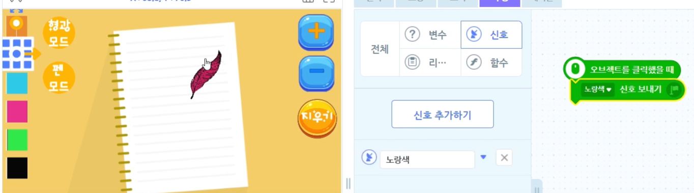 노란색이라는 신호를 보내줄게요. 그러면 펜이 그 신호를 받아서 펜의 그려지는 색상을 노란색으로 변경해 줄 거랍니다.