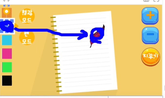 오른쪽의 플러스 버튼과 마이너스 버튼으로 펜의 굵기를 굵게 가늘게 만들어 줄거랍니다.