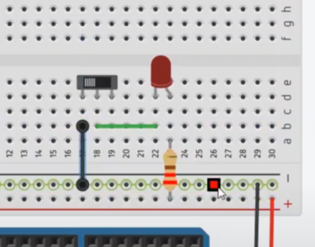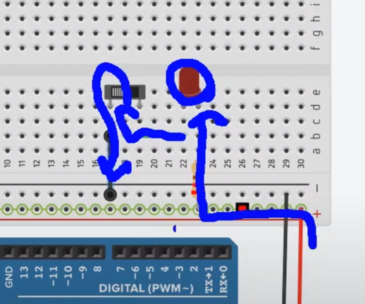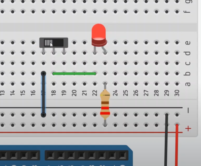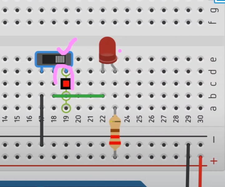 그러면, LED와 회로를 연결해 볼게요. 아래와 같이 LED의 음극 라인이 슬라이더를 통해서 흘러나갈 수 있도록 연결을 해 보겠습니다.