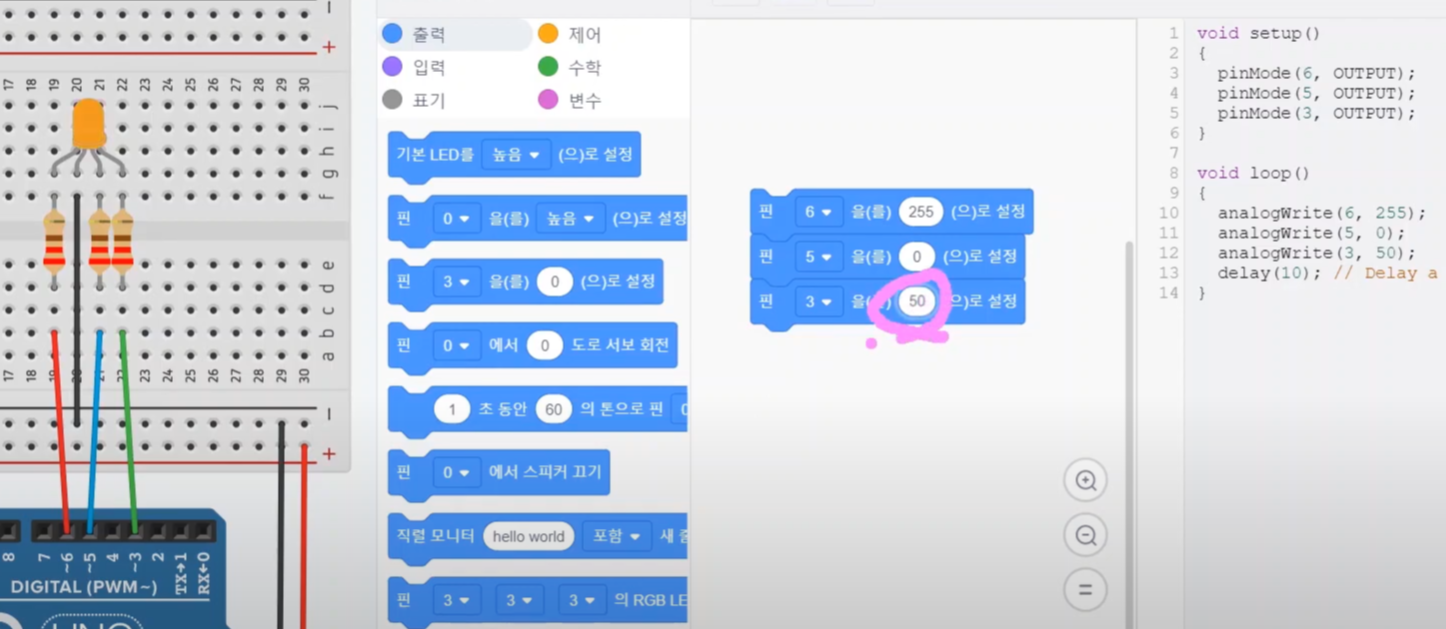 이렇게 PWM 출력 범위를 각 색상별로 다양하게 조절해 가면서, 보다 다양한 색 표현이 가능해집니다.