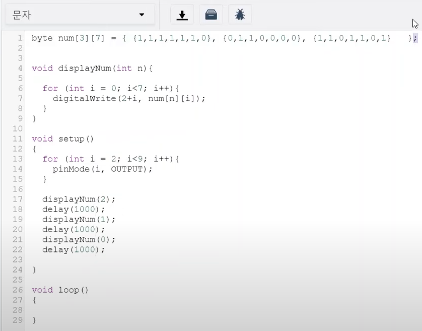 그래서 { 1, 1, 1, 1, 1, 1, 0}으로 8번핀으로 연결된 LED만 끄고, 나머지 모든 LED를 켜주면 디지털 숫자 0이 만들어집니다. 이러한 형식으로 0, 1, 2라는 디지털 숫자를 만들기 위한 배열을 아래와 같이 만들었습니다.