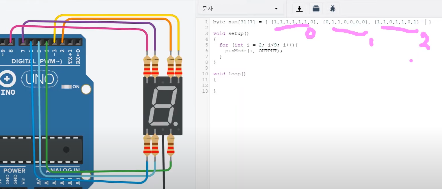 7세그먼트의 회로 구성은 이전 포스터에서 작성했던 동일한 회로로 진행을 하겠습니다.