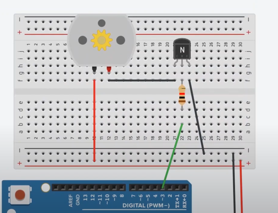 저는 모터의 그라운드 라인을 트랜지스터를 통해 흘러가도록 아래와 같이 회로를 연결해 줄게요.