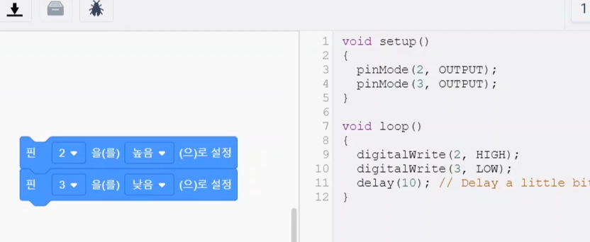 코드를 작성해 주실 때는, 아두이노 보드로 연결된 2번 핀과 3번 핀만 코딩해 주시면 됩니다.