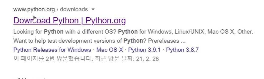 먼저 구글에서 "파이썬 다운로드"로 검색을 하시면,