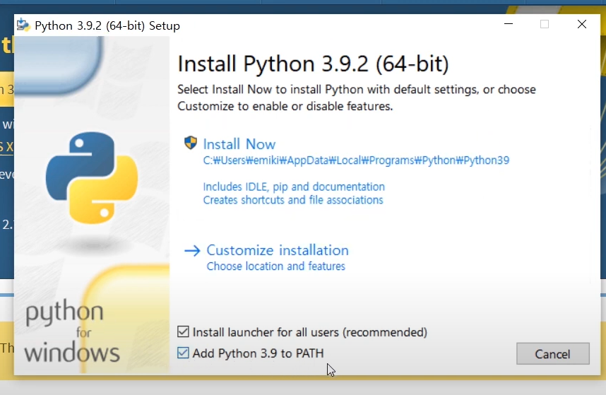 하단의 "Add Python to PATH" 박스를 체크하신 후, "Install Python"을 클릭해 주세요.