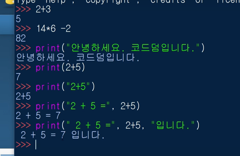 print(2+5)처럼, 따옴표를 적지 않으면, 계산 결과가 뜬답니다.