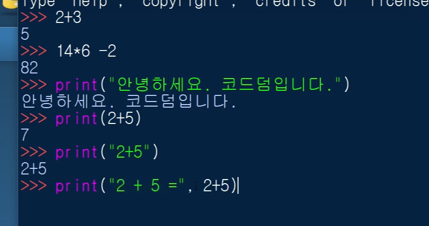 print(2+5)처럼, 따옴표를 적지 않으면, 계산 결과가 뜬답니다.