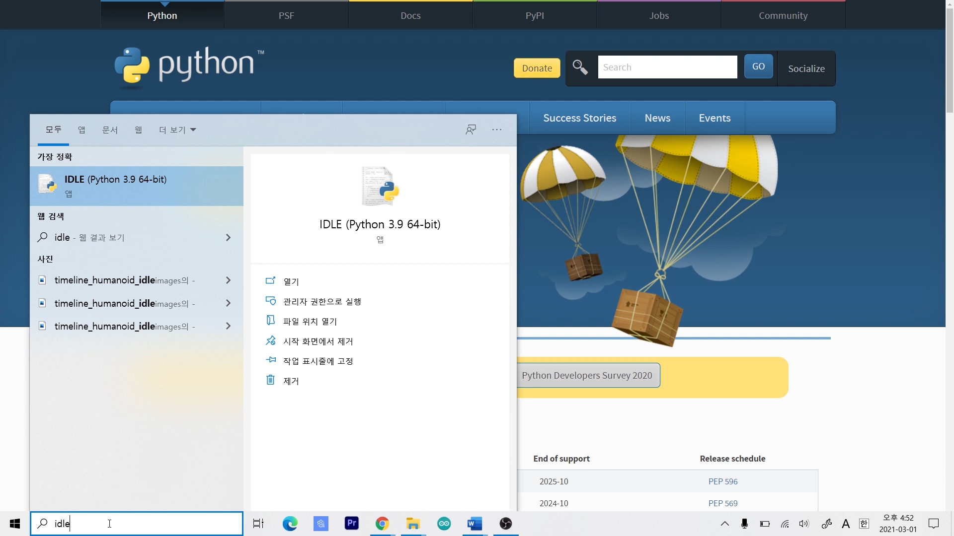 설치가 완료되고 나면, 윈도우 검색창에서 "python" 또는 "IDLE"로 검색해 줍니다.
