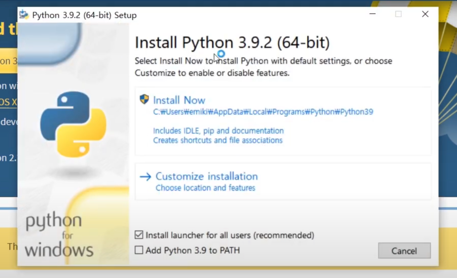 하단의 "Add Python to PATH" 박스를 체크하신 후, "Install Python"을 클릭해 주세요.