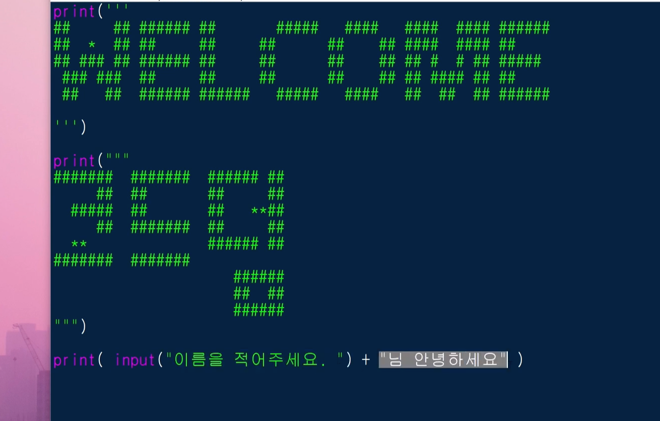 오늘은 예제로 배우는 파이썬 3강입니다! 지난 시간에 여러 줄 문자를 출력하는 방법에 대해 소개를 해드리고, 아스키 아트를 출력해 보았는데요~