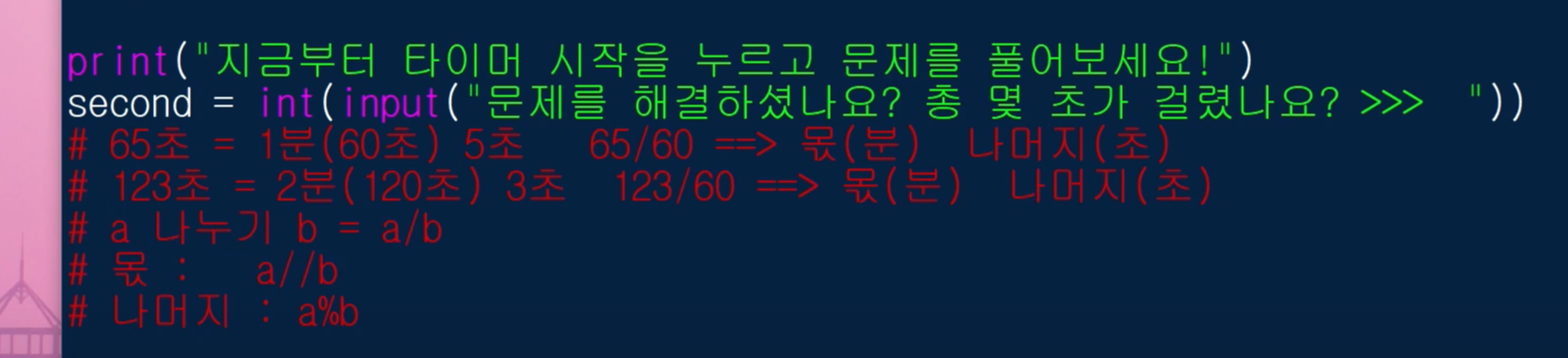 그래서 입력한 second를 60으로 나눴을 때의 몫과 나머지로 분과 초를 계산해 주겠습니다.