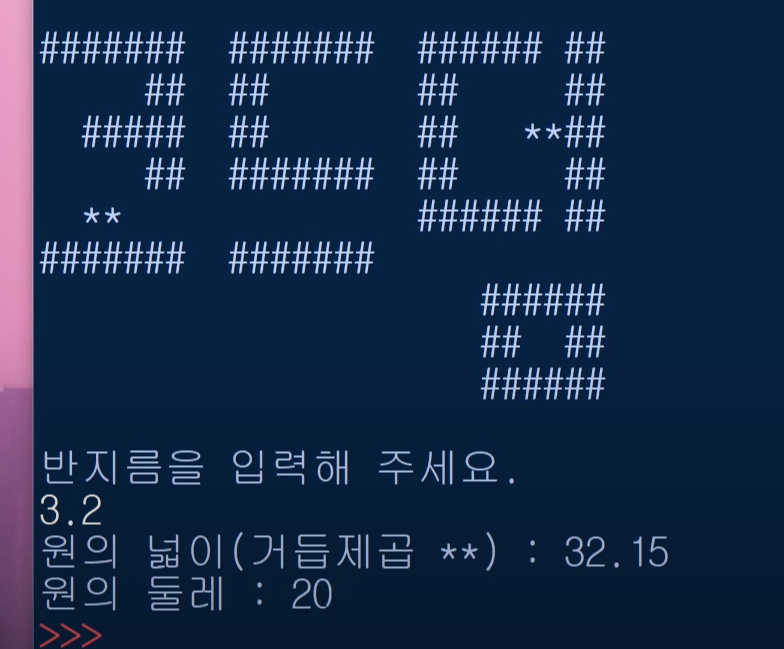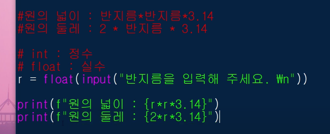 그래서 변수를 사용해서, 원의 넓이와 둘레를 구하는 수식을 변수에 담아서 아래와 같이 표현해 줄 수 있어요.