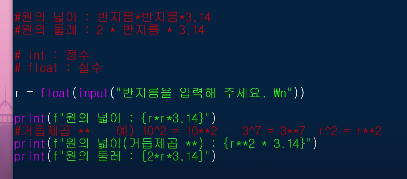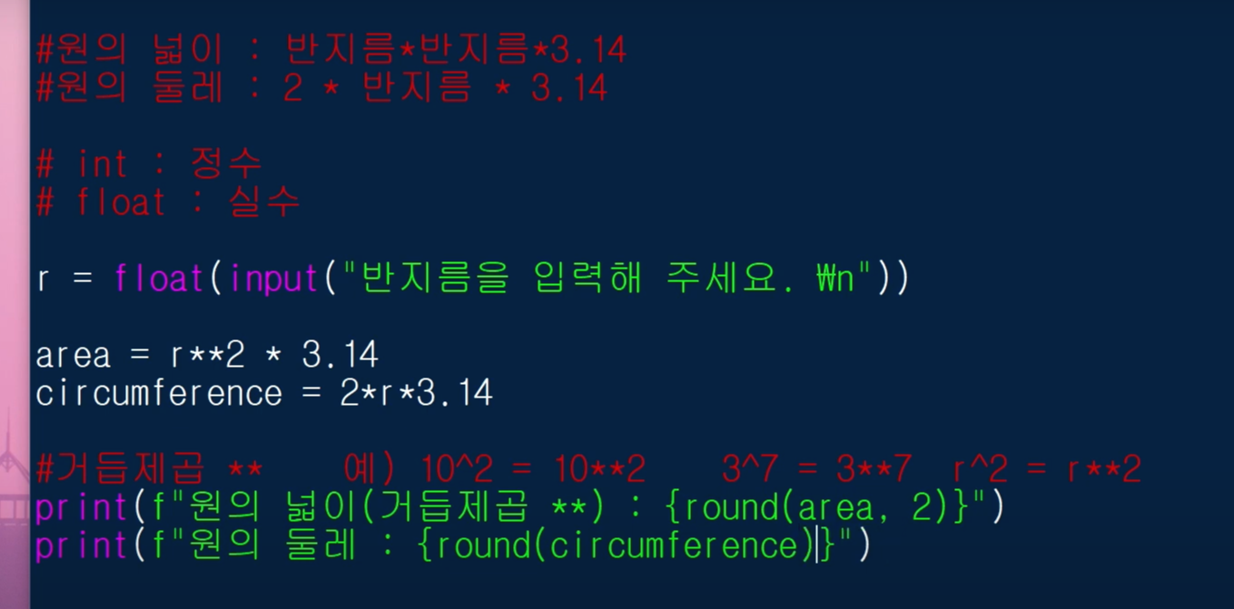 예제로 배우는 파이썬, 7강에서는 거듭제곱 연산자를 사용해서 원의 넓이를 구하는 방법과 반올림을 하는 방법에 대해 소개해 드립니다.