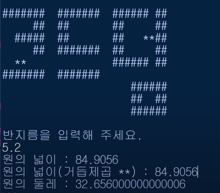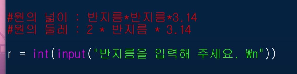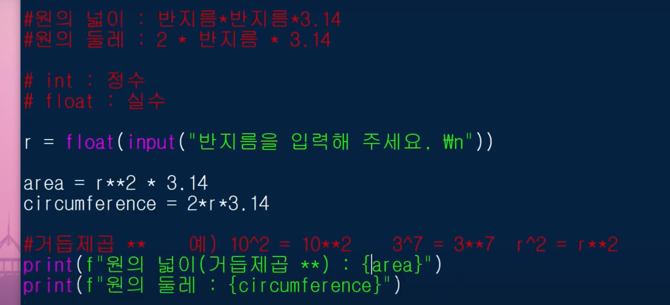 그래서 변수를 사용해서, 원의 넓이와 둘레를 구하는 수식을 변수에 담아서 아래와 같이 표현해 줄 수 있어요.