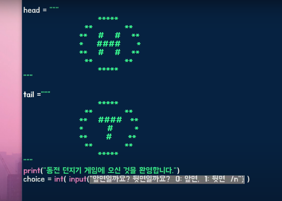 사용자가 추측한, 앞면 또는 뒷면의 값을 저희는 숫자로 입력받아서, int()로 변환 후, choice라는 변수에 저장을 해 둘게요.