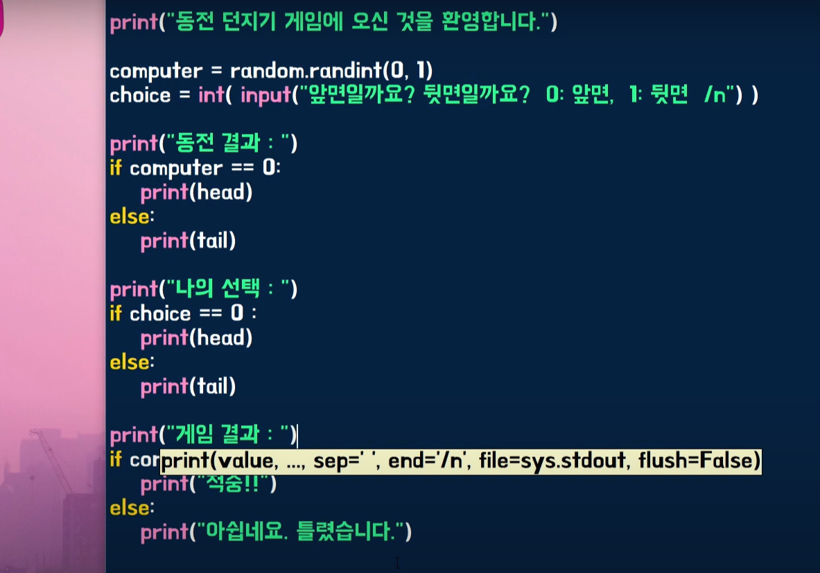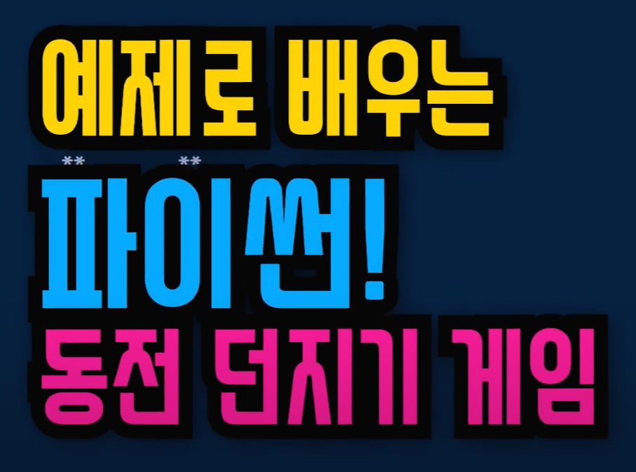 예제로 배우는 파이썬 9강에서는 동전 던지기 게임을 한번 만들어 볼 거예요.