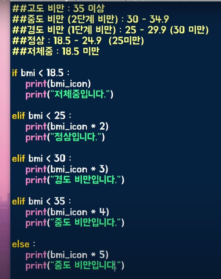 그래서 BMI 조건에 따라 아래와 같이 출력시켜 줄 수 있어요.