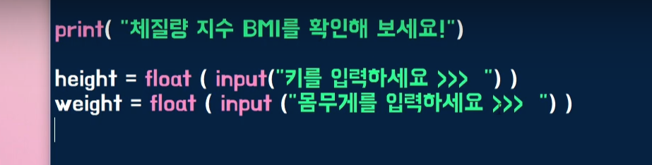 키와 몸무게는 소수점 자릿수도 입력할 수 있도록 input()을 사용해서 입력을 받고, 그 값을 float() 함수를 사용해 수로 변환시켜 주겠습니다.