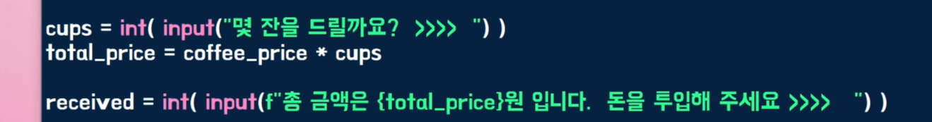 input으로 돈을 투입하라는 메시지를 띄우고, 그 값을 received라는 변수에 담아둘게요.