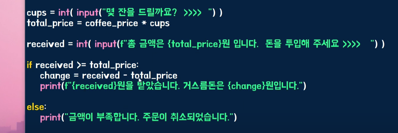 저는 금액이 부족한 경우와 거스름돈 계산을 if문을 사용해서 조건을 달리 두었습니다.