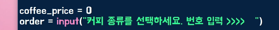 먼저 메뉴를 주문받기 위해서, input() 함수를 사용해서 order 변수에 담아줍니다.