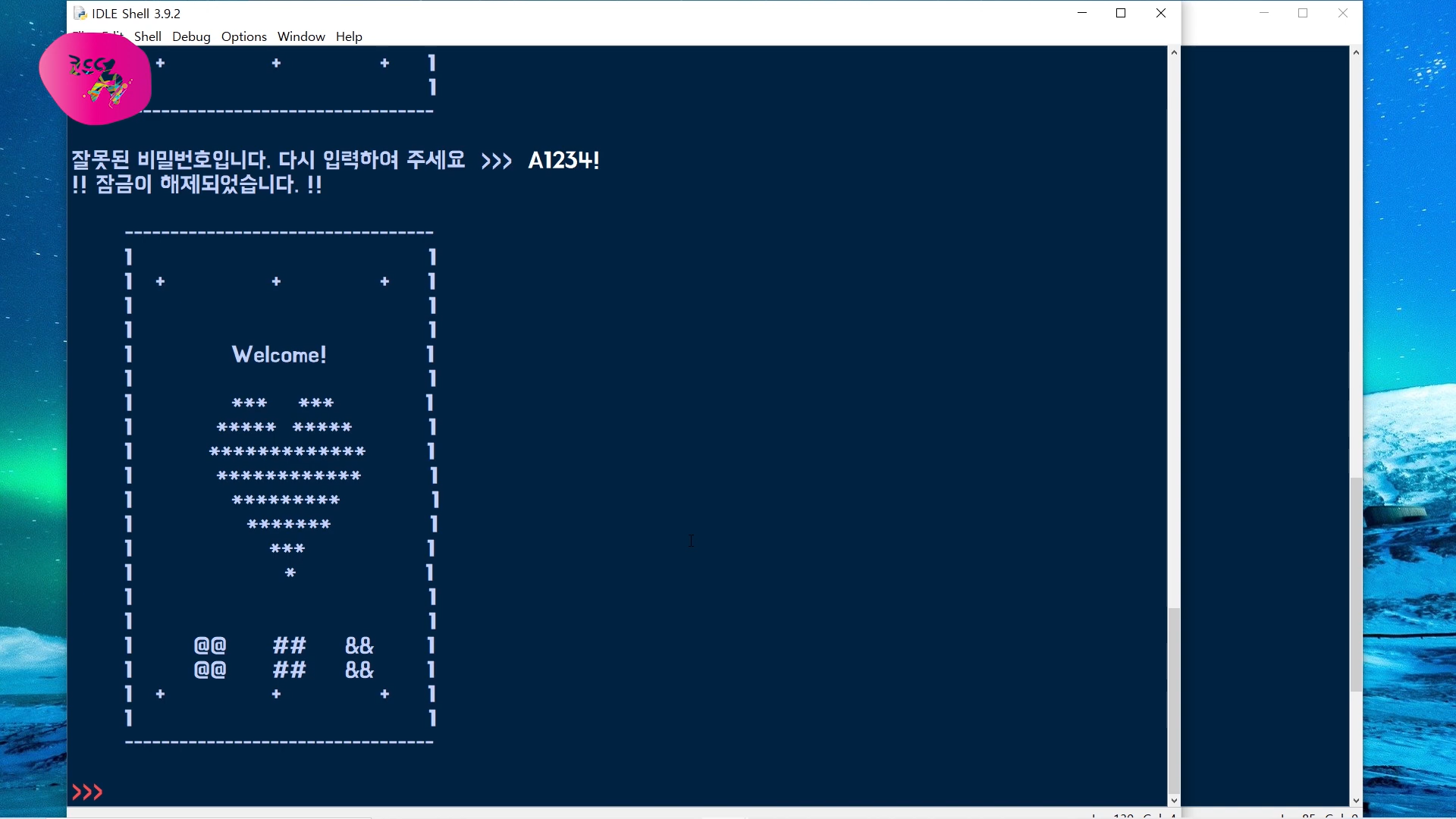 그리고 정확한 비밀번호를 입력한 경우는 while문을 빠져나간 경우이기 때문에, while문 밖에 "잠금 해제" 메시지를 띄워 줄게요.