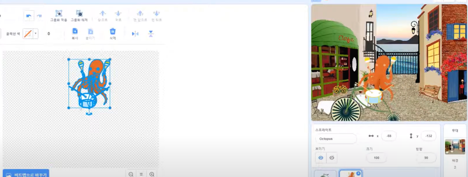 이렇게 코딩하면, 문어가 아래 그림과 같이 자전거 중앙에 붙어서 따라간답니다.
