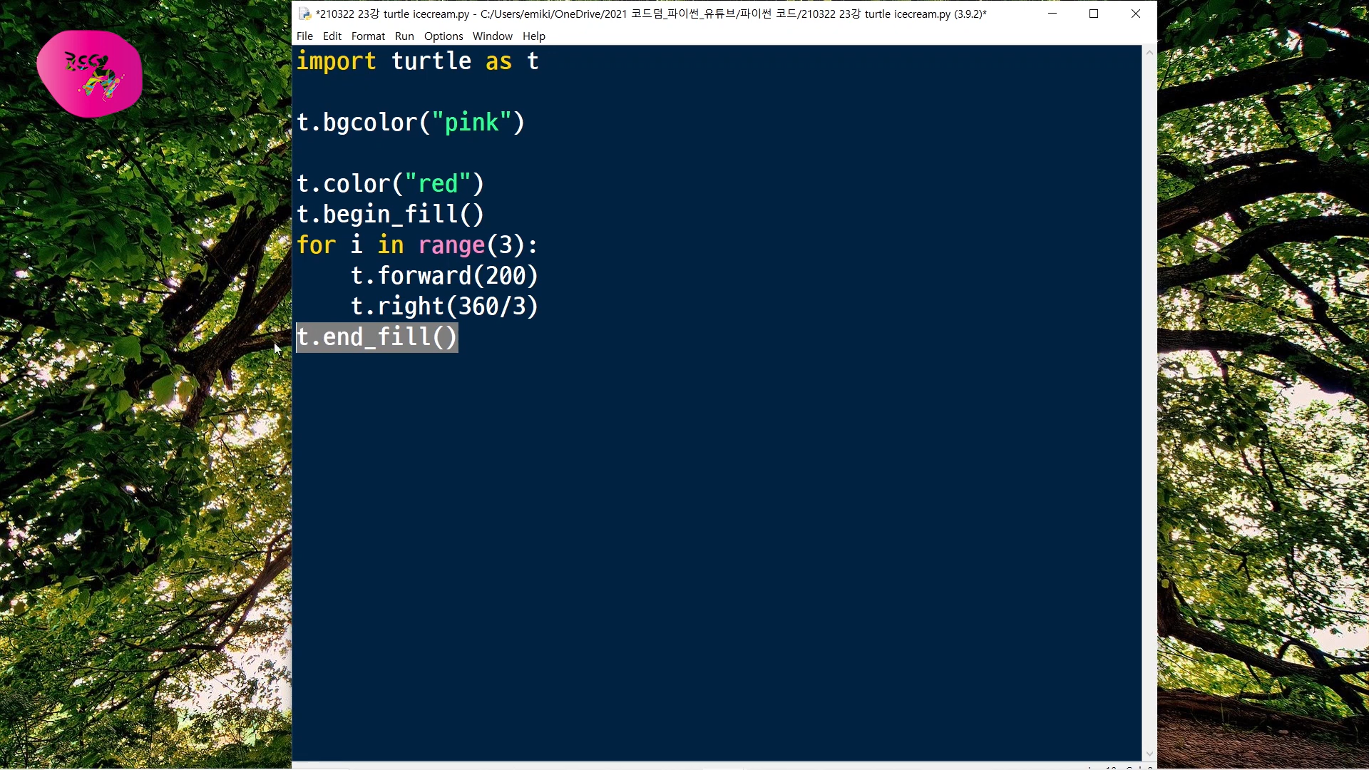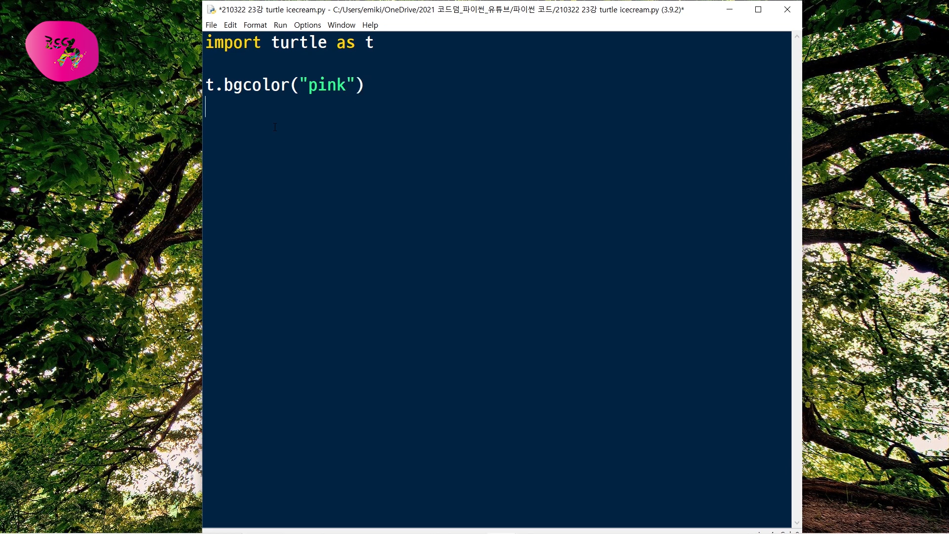 배경색을 변경하고 싶다면, t.bgcolor("pink")처럼 입력해 주시면 되세요~