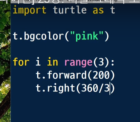 배경색을 변경하고 싶다면, t.bgcolor("pink")처럼 입력해 주시면 되세요~