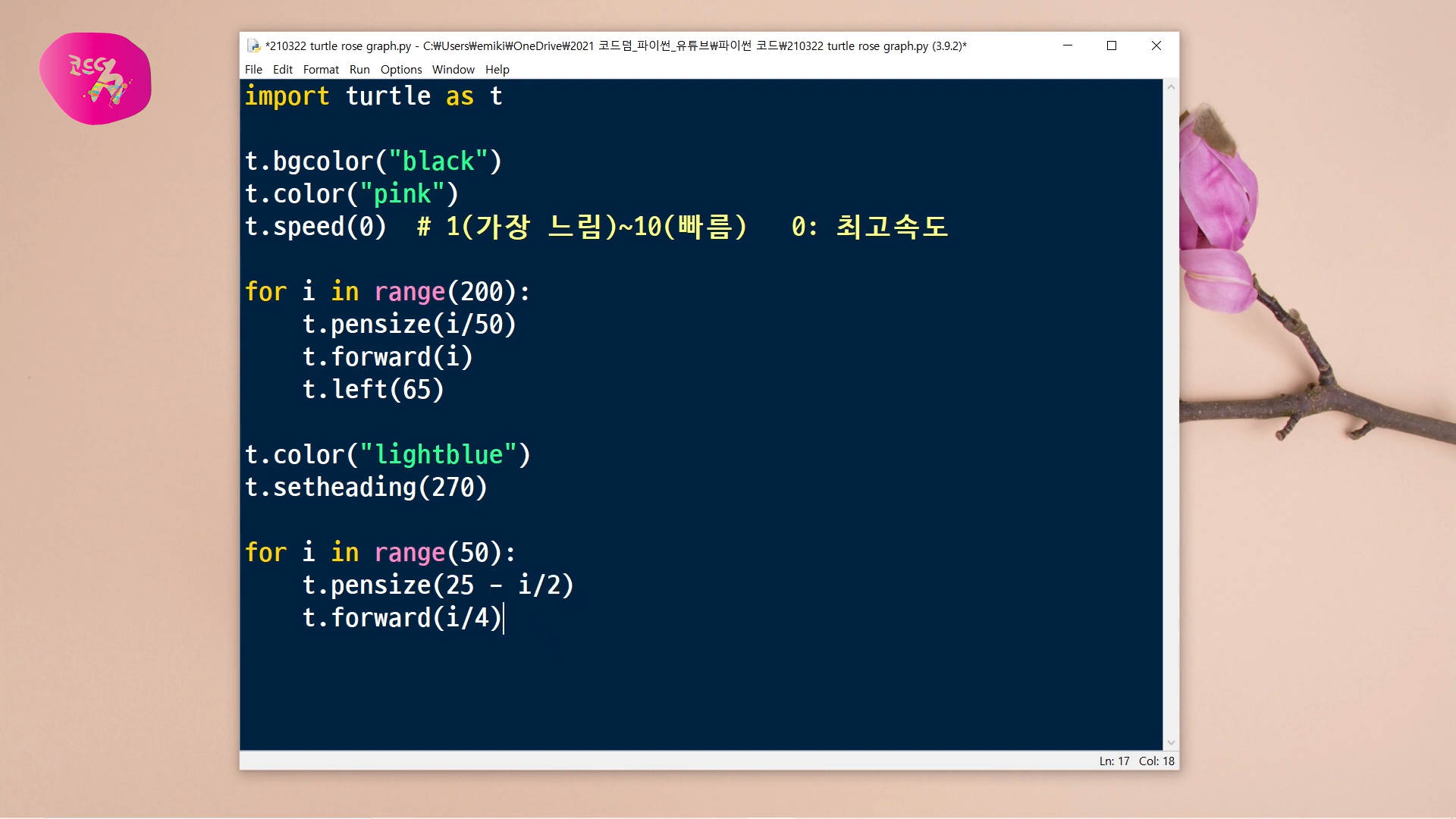 그리고 점점 펜 굵기도 굵어지도록 만들어주기 위해서, pensize를 아래와 같이 지정해 줄게요.