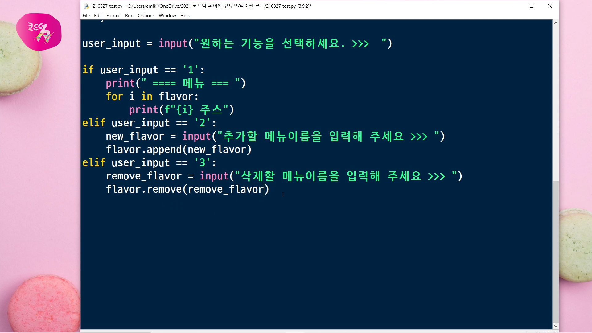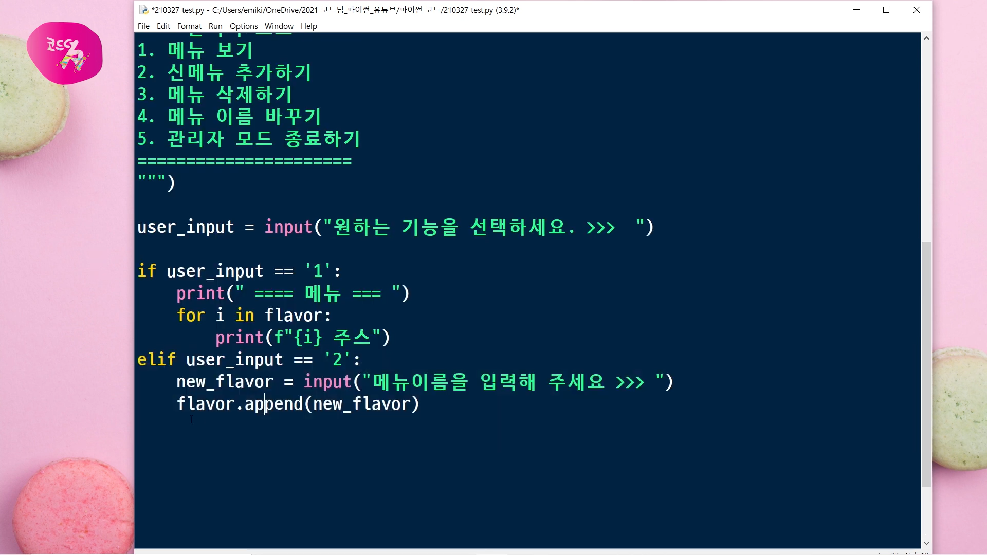 메뉴 이름을 입력받아서, 리스트에 .append()로 입력받은 값을 담아주겠습니다.