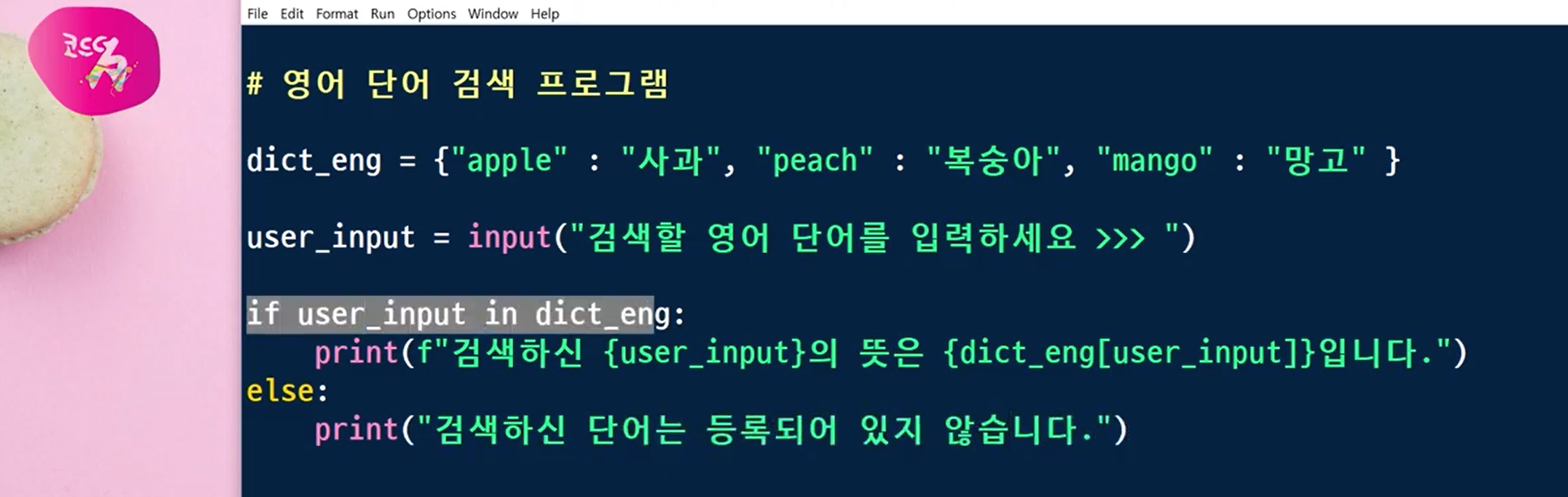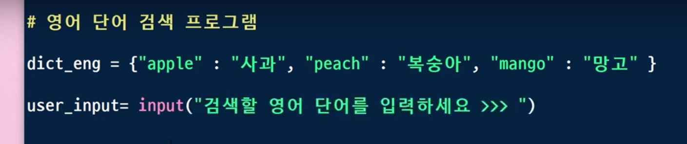 if user_input in dict_eng: 라고 하면, 딕셔너리 dict_eng내에 user_input이라는 키값이 있으면, True가 반환되고, 그렇지 않으면 False가 반환됩니다.