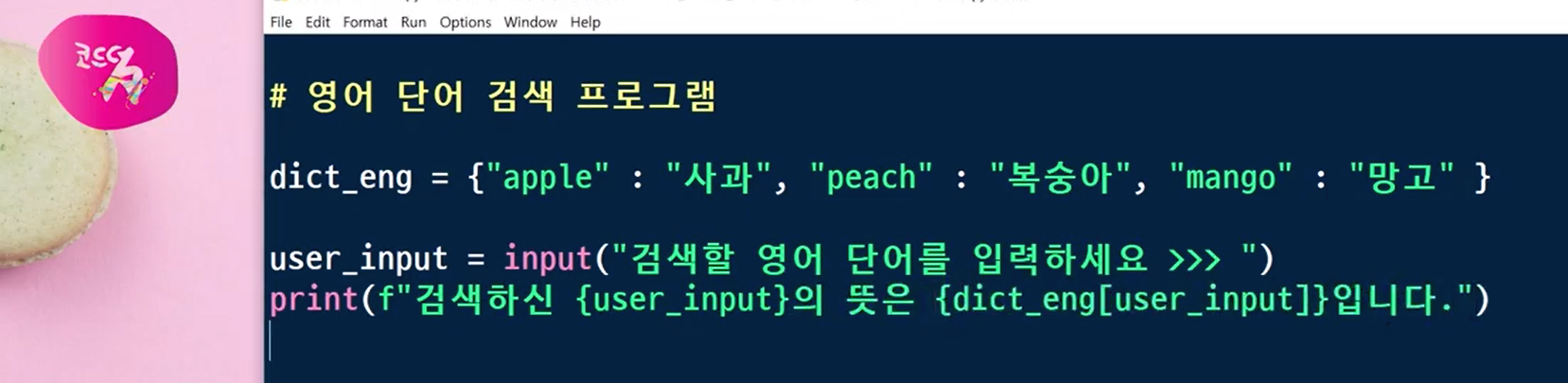 그래서 dict_eng라는 딕셔너리에서 [user_input]을 검색하면, 바로 그 값, 즉 뜻을 찾을 수 있는 거죠~