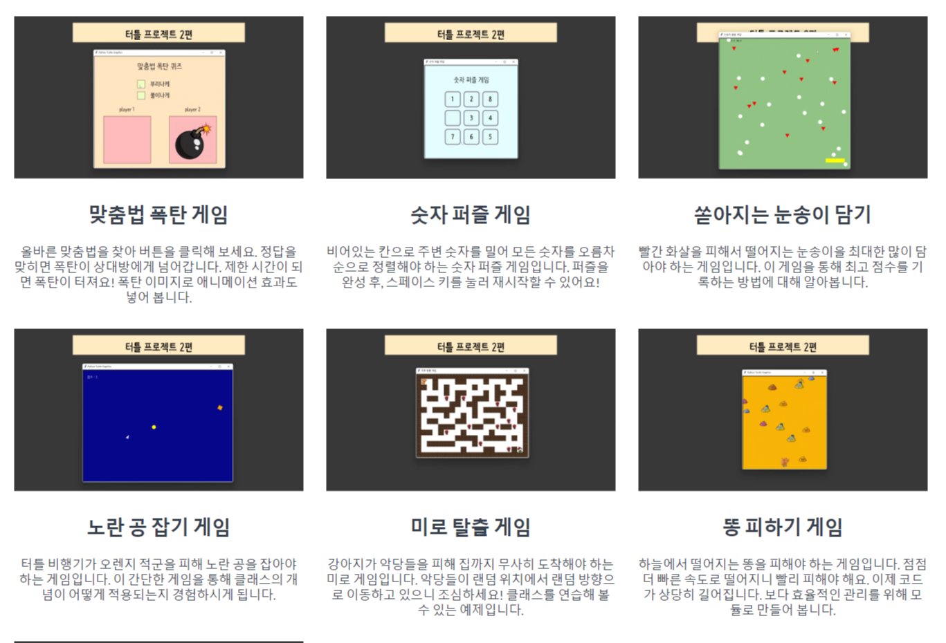 입문과정에서도 다음과 같은 작품들을 만들어 나가며, 파이썬의 기초를 다져나갈 수 있습니다!