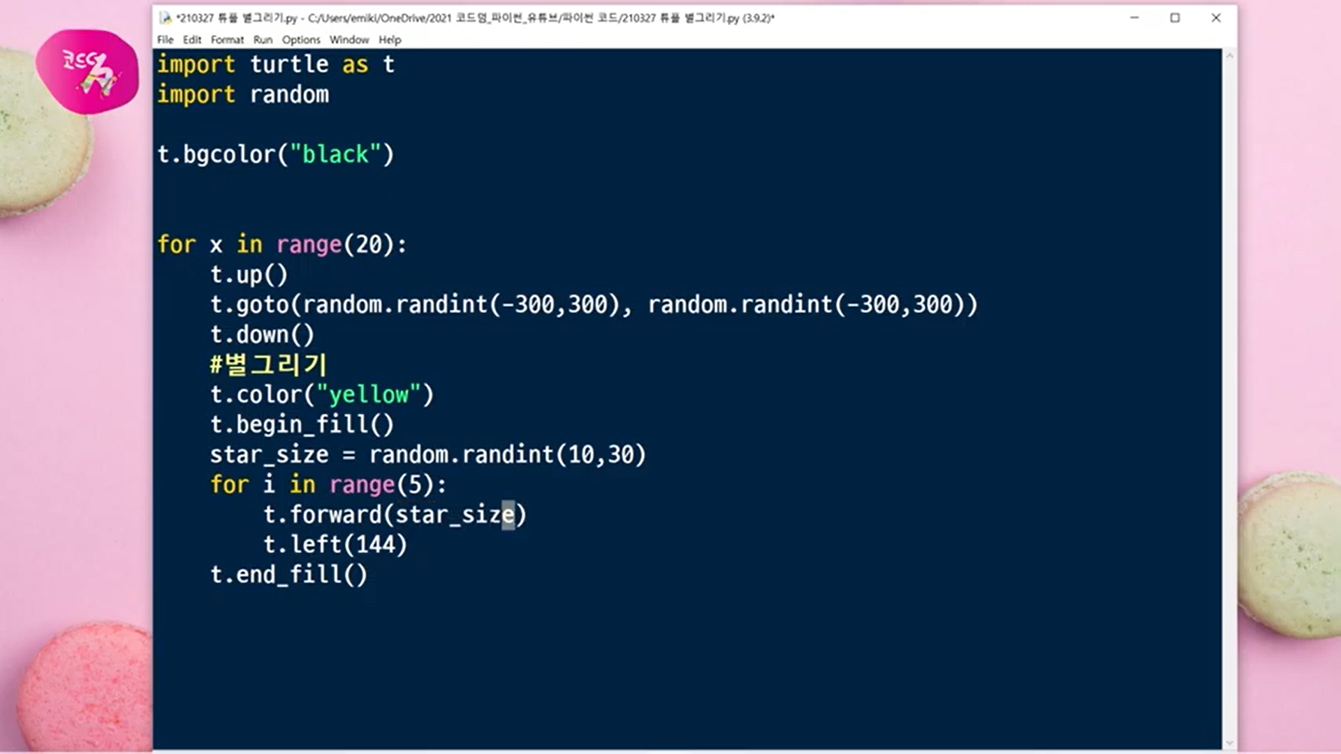 별의 크기에 랜덤으로 변화를 주기 위해서는, 별의 한 변이 그려지는 t.forward()의 값을 조정해 주면 됩니다.