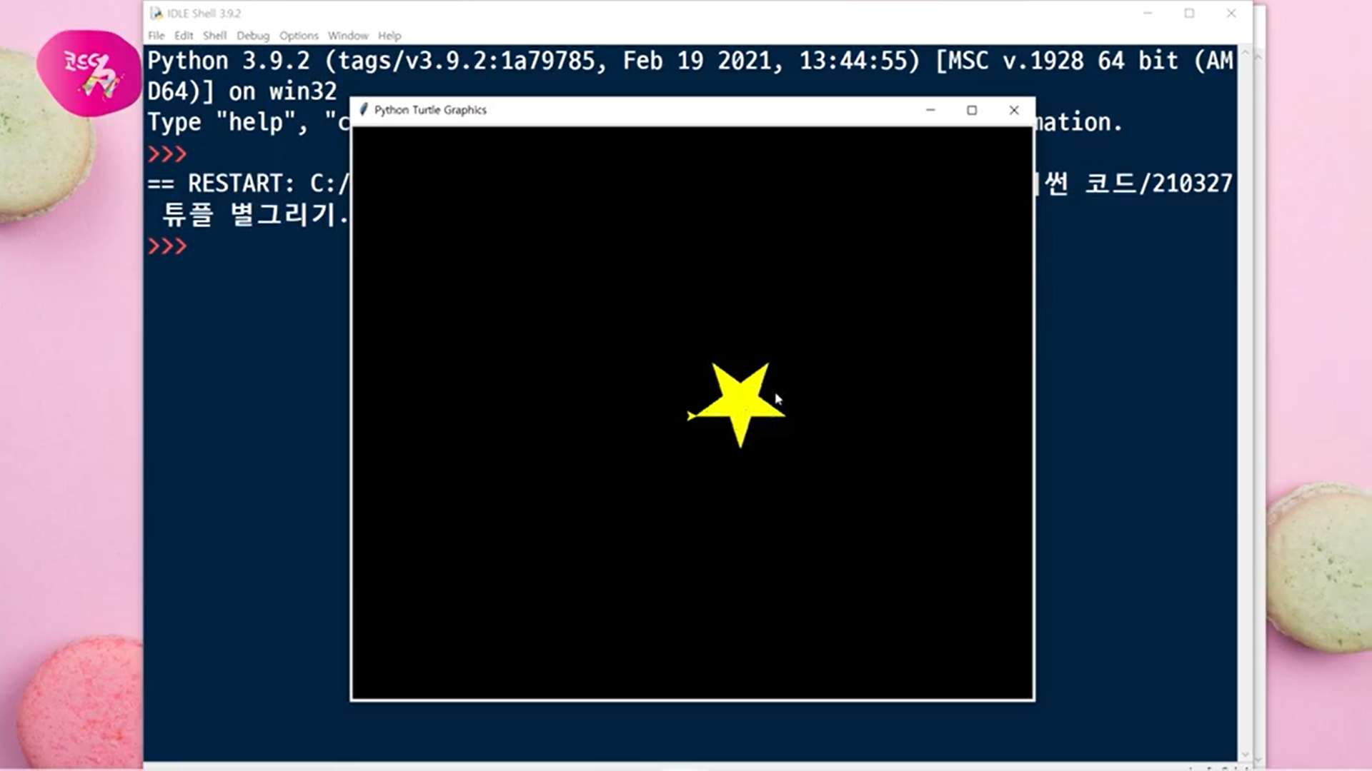이렇게 실행시키면 아래와 같이 검정색 배경에, 노란 별이 그려집니다.