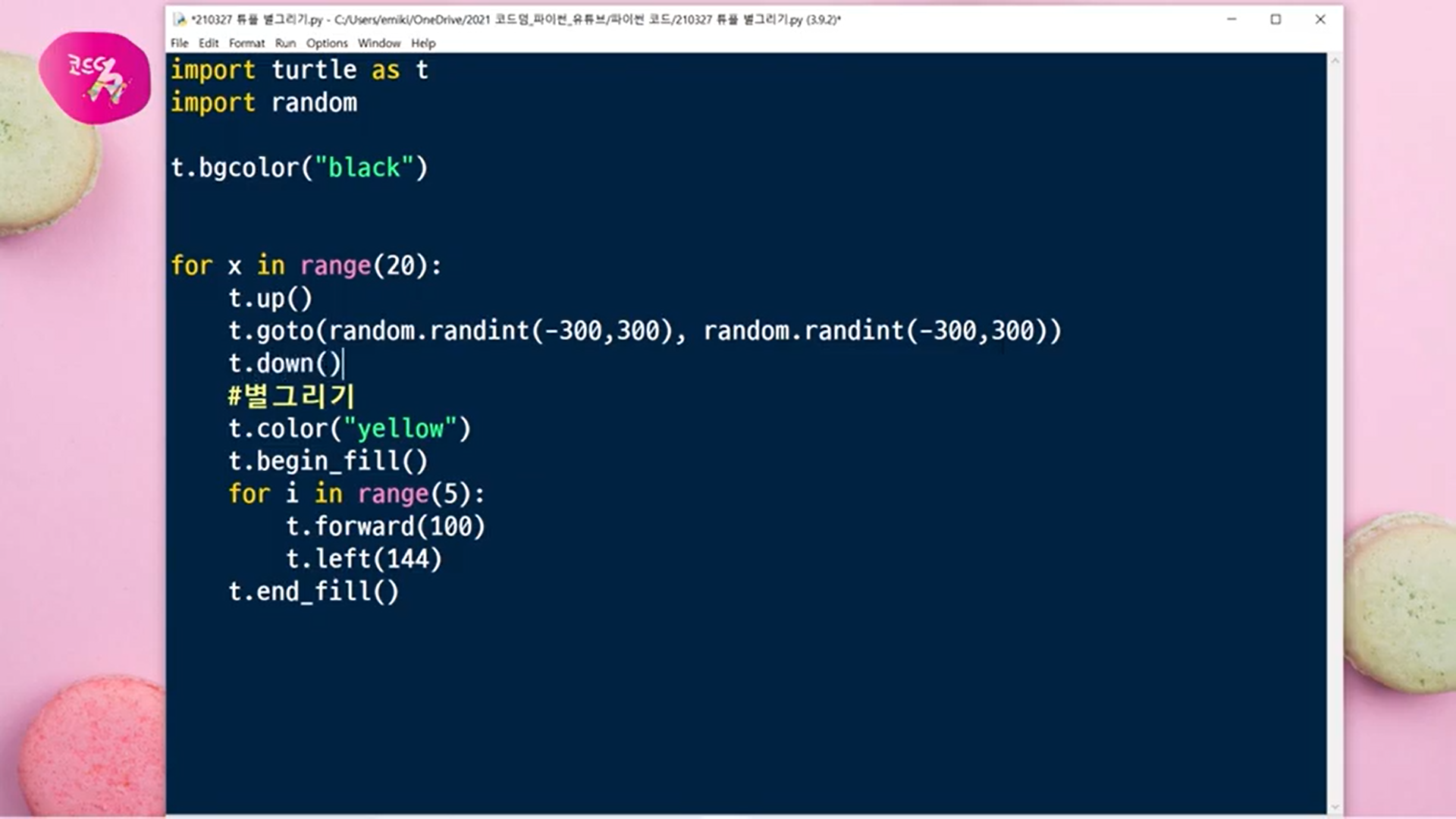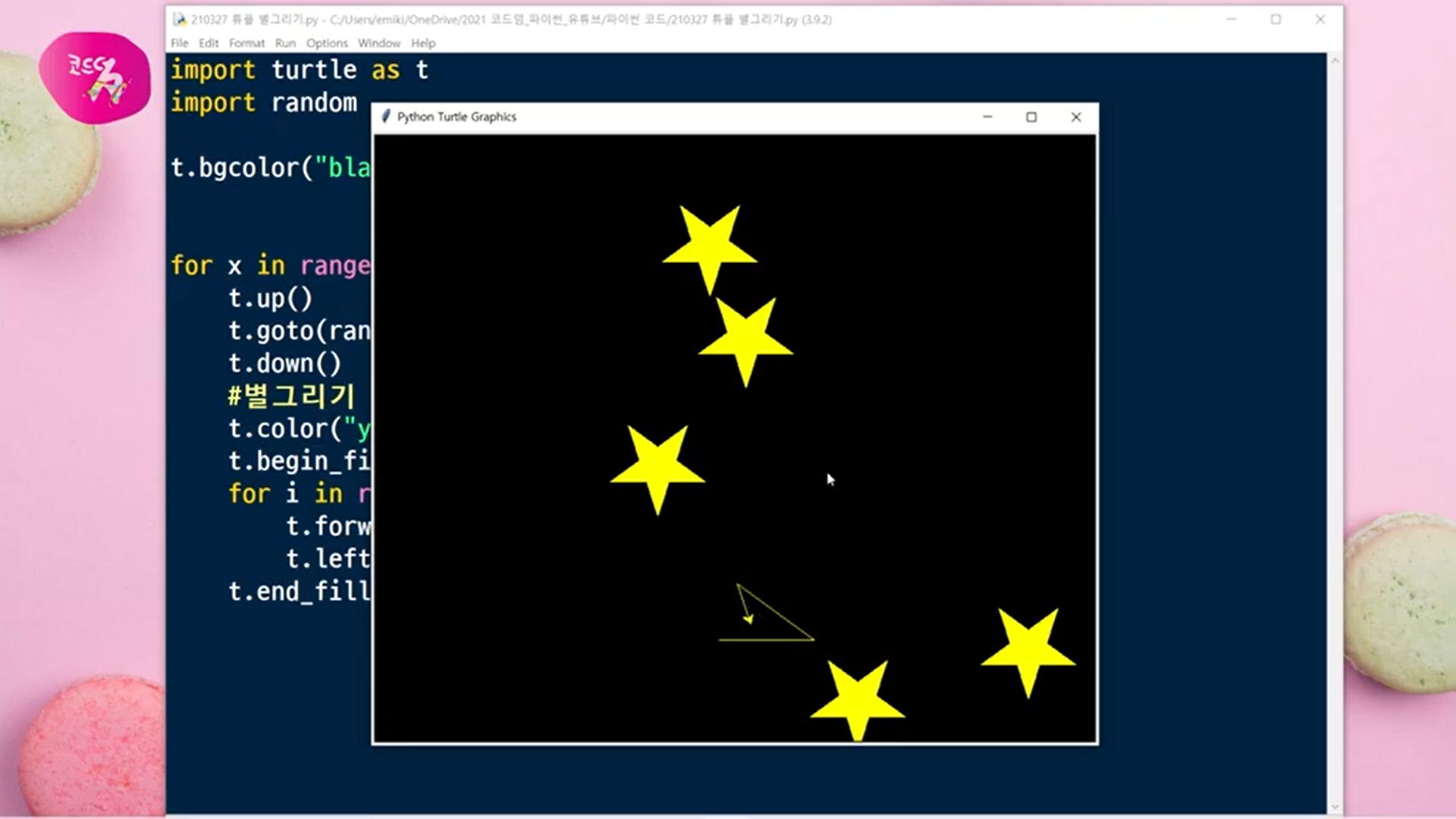 이때, 각각의 별을 랜덤 위치로 이동시키기 위해서, t.goto()로 랜덤 위치로 이동시켰습니다.