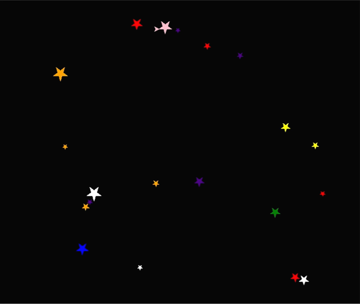 이렇게 하면, 아래와 같이 다양한 색상의 별들이 여기저기 그려집니다~