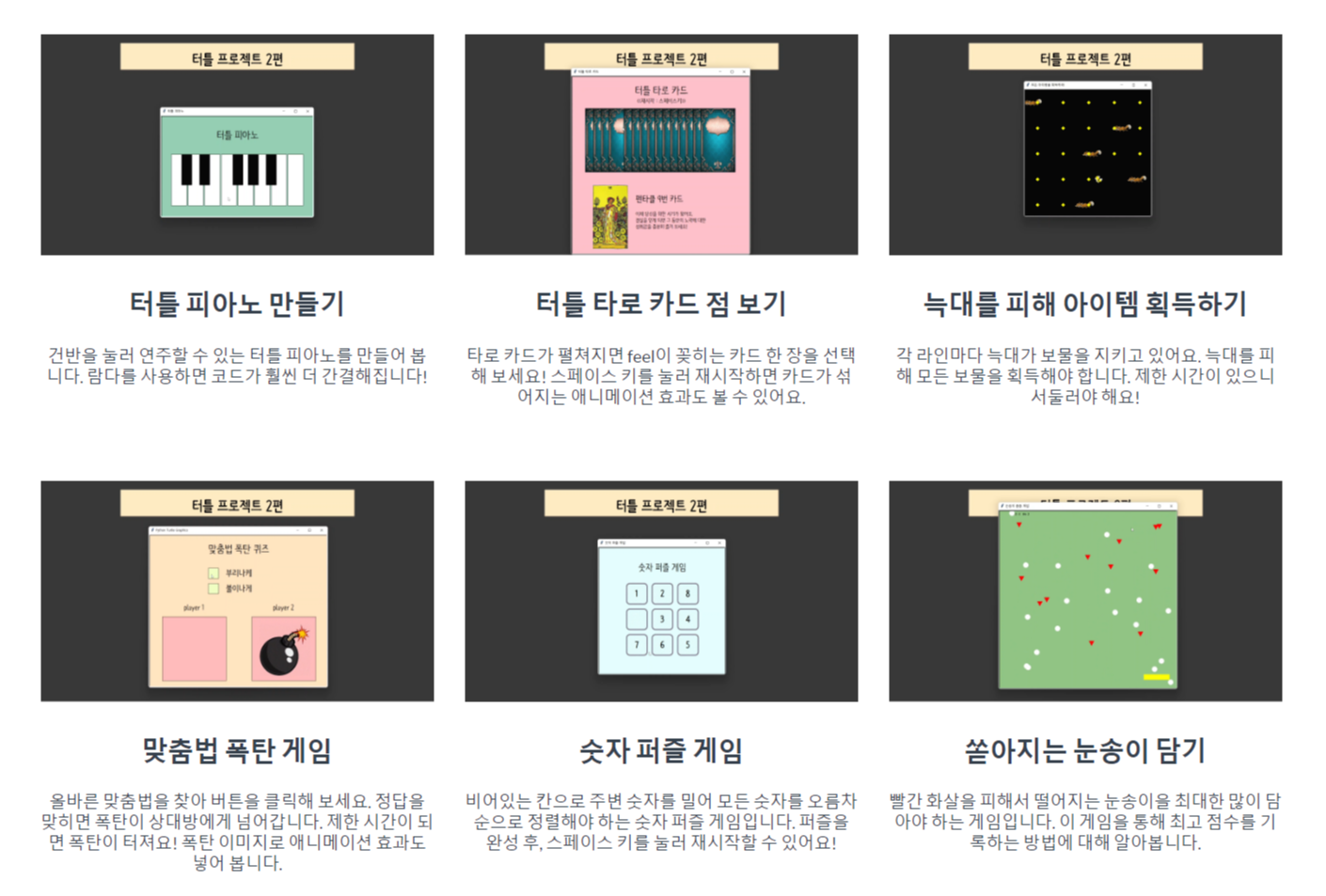 점프 게임, 숨은 터틀 찾기, 타로 카드 점보기, 미로 게임, 청기 백기 게임 등 다양한 프로그램 만들기에 도전해 보세요!