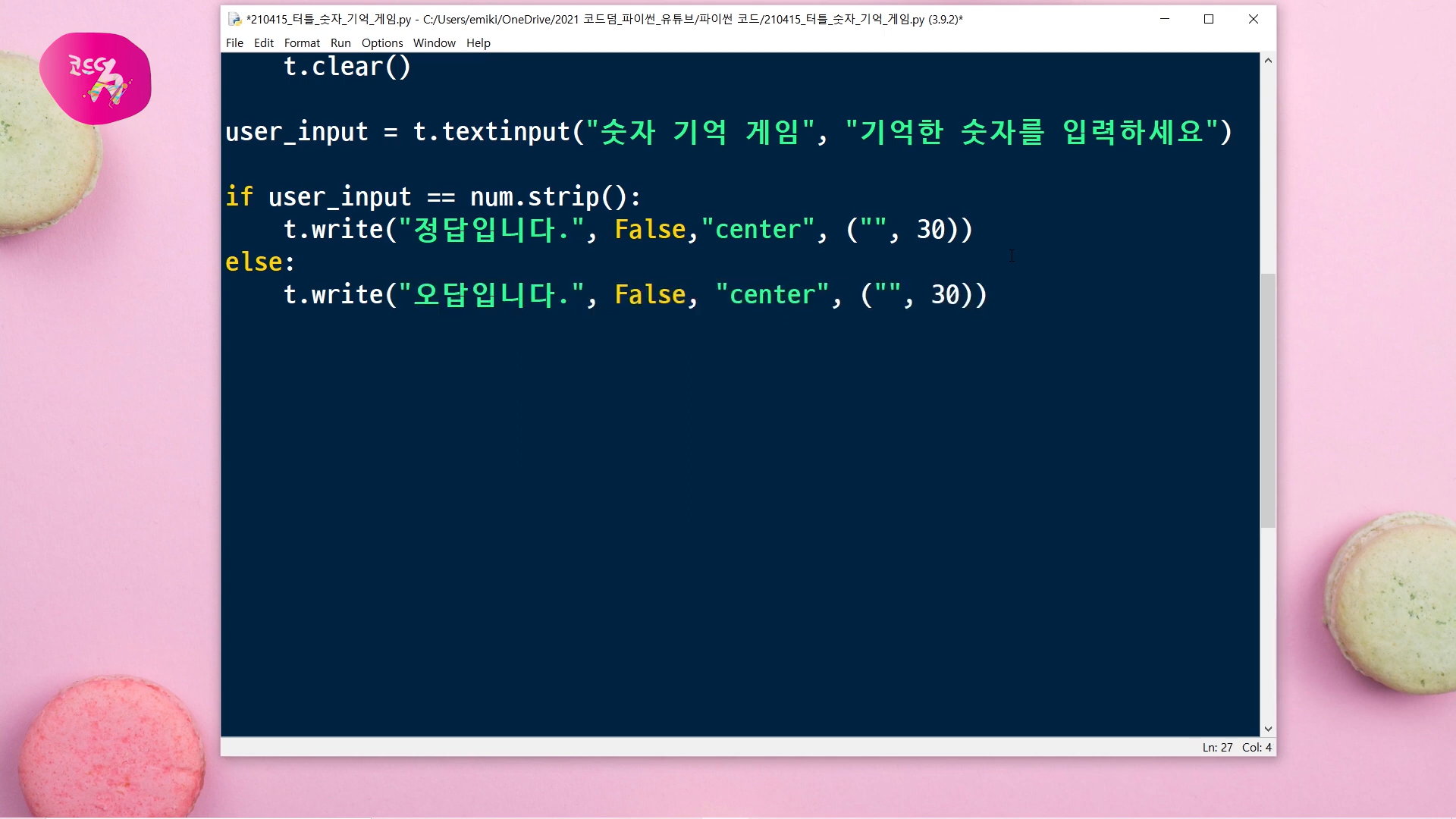 도전해 보신 후, 해당 코드는 상단의 영상을 통해서 자세한 설명과 함께 확인하실 수 있습니다~
