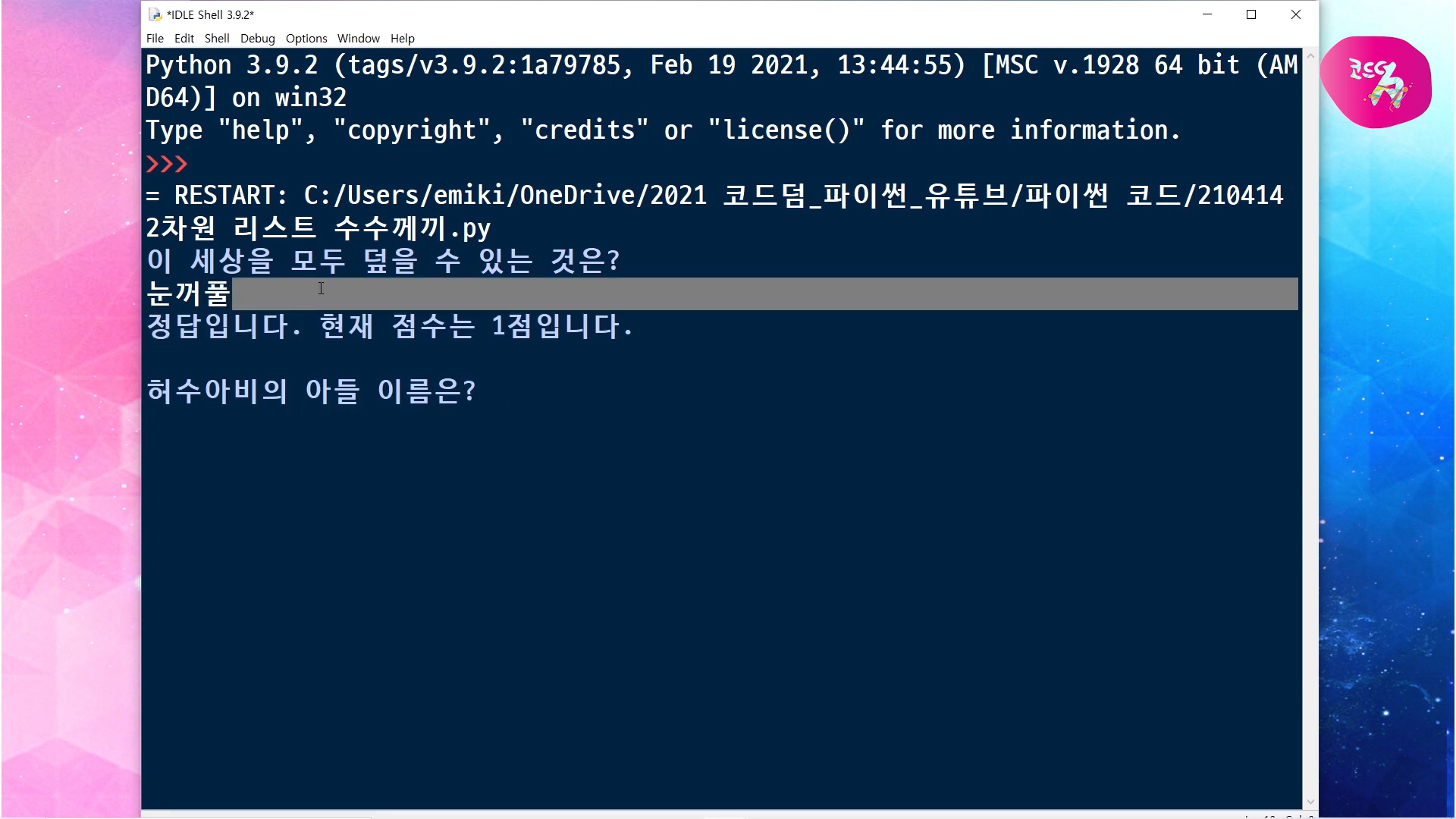 간단하게 수수께끼를 푸는 프로그램을 2차원 리스트를 사용해서 만들 건데요.