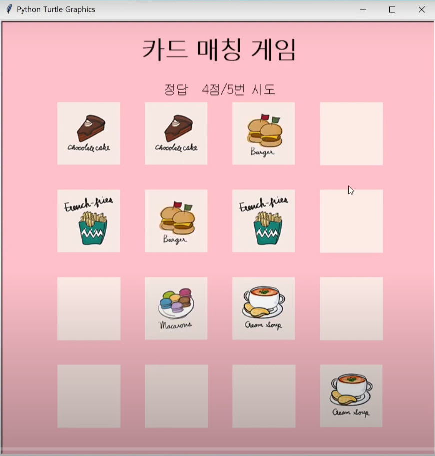 동일한 카드를 찾으면, 아래와 같이 이미지가 뜨고,